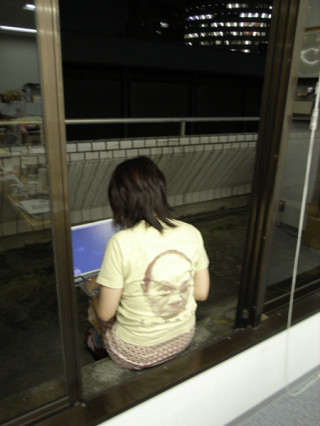 のむこうに、 窓枠に座って仕事をしている人が? なんで、そこで仕事せなあかんねん。 なんだか、哀愁さえ漂ってますけど?