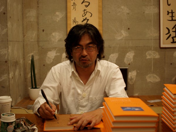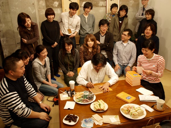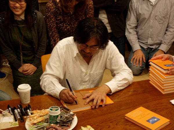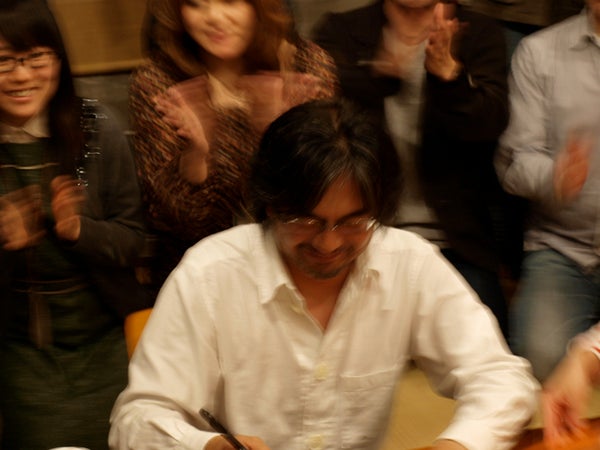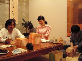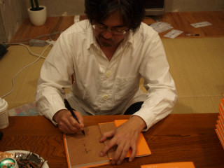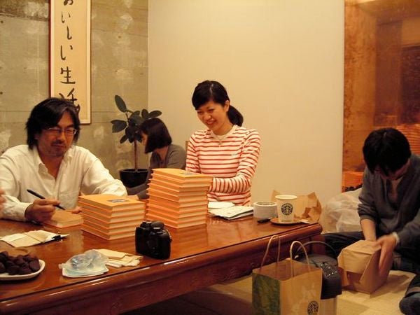 サイン中の菅原さん、あとちょっとで1000冊ですが、その前にちょっと休憩。コーヒーをのみつつ、写真の話やらサッカーの話やら京都の話やらをたのしくしております。