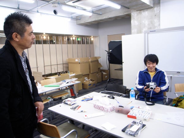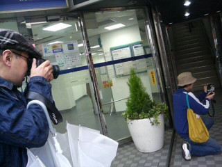 「福田のフォト絵。」の福田さんの取材は青山に場所を移しました。そこに社長が登場です。「あれ? 福田さんが きてるって 聞いたけど、どこかな?」はい! 本日のお題は、「福田さんのカメラは来てるけど、 本人はいない」です。演じてまいりましょう!福田さん、カメラに乗り移ってカメラがしゃべるというシチュエーションを編み出し、社長と会話を続けます。「それはそうと、モギな。 事実の奥にある 真実をちゃんと伝えろよ。」むつかしいこと急にいわないでください。こまるぅ〜。