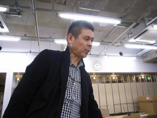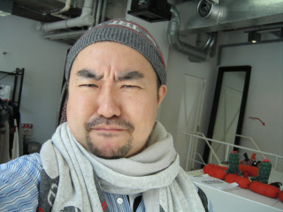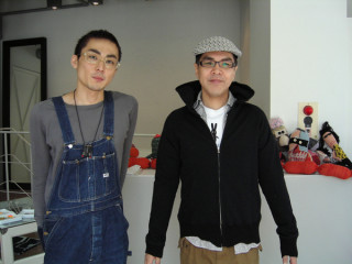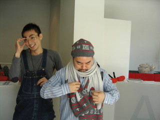 好評をいただいている平武朗さんのシャツ、ファッションの世界ってはやいものでもう次の秋冬物のサンプルができている、というのでぼくらもその展示会を覗いてきました。「着させて着させて!」と、おじさんふたり、たのしんでまいりました。のは「ふにゃふにゃしたパーカ」。すそや、袖のリブのカッティングが波打っているんです。ぼくのは、「垂れたような表現のニットの切り返し」のショールと、おそろいのニット帽。3枚目の画像は「オフの日の朝青龍の顔マネ」ではありません。しつれいいたしました。