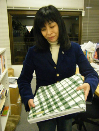 最近ちょくちょく「ほぼ日」オフィスにいらっしゃるマーコさん。きょうもこんばんは。いつもマーコさんは原稿書きにいらっしゃるので、ノートパソコン持参です。「みてみて、ハラマキがね、 私のノートパソコンにぴったりなの!」ほ、ほんとだー。サイズはフリーサイズをお使いだそうですよ。ナイスアイデア! マーコさん!