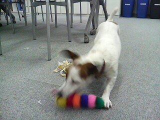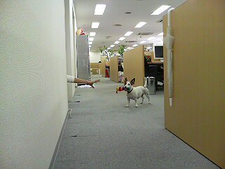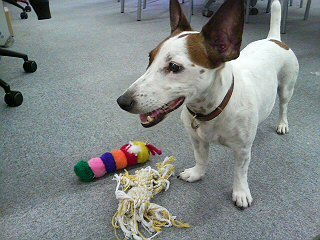 今日は、ブイヨンが出社しています〜沢山のおもちゃを、あれもこれも選べずに、ぜんぶ独り占めです!工作室に行っては、ぐっさんをからかい、ミーティング中のTシャツチームに挨拶をし、オフィスを闊歩しています。今日は天気がよくて、ブイヨンもご機嫌です。