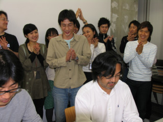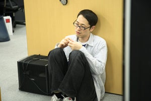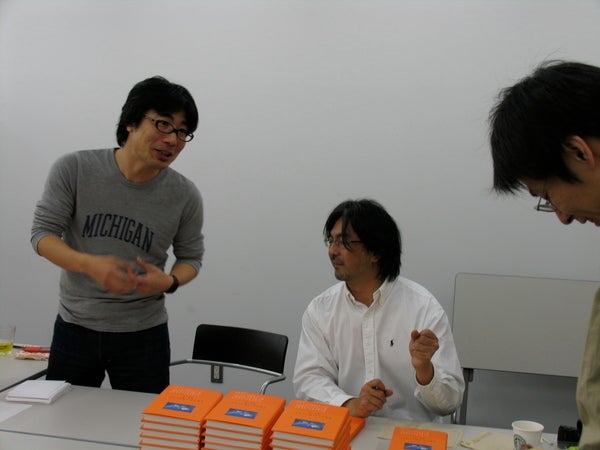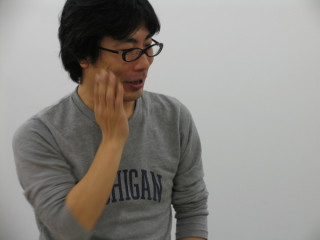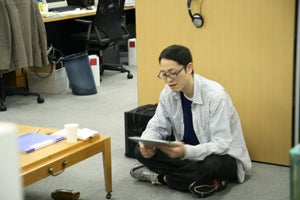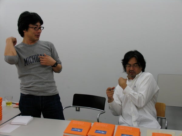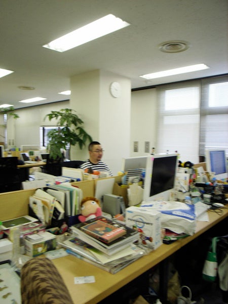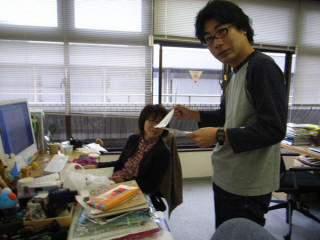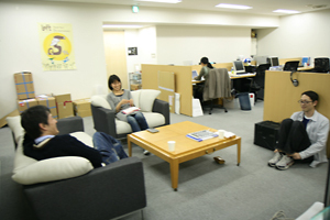 ふだん大きなが床に小さく座って、大きな計算機でなにか計算しています。どうやら、 と と何かミーティングしていたようす。大きなが床に座るとだいぶちいさいですね。「ジブン、昔はこんなんじゃなかったんスよね。最近、体力おちたっていうかー、通勤電車キツイっていうかー…」 「あはははははは〜」体育座りで「昔」をふりかえる、ふだんは大きい、でした〜