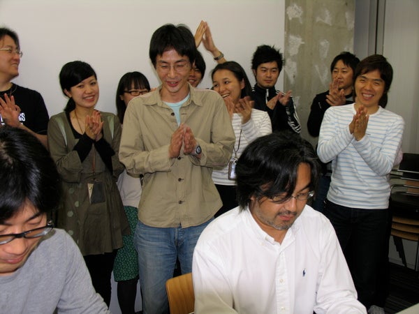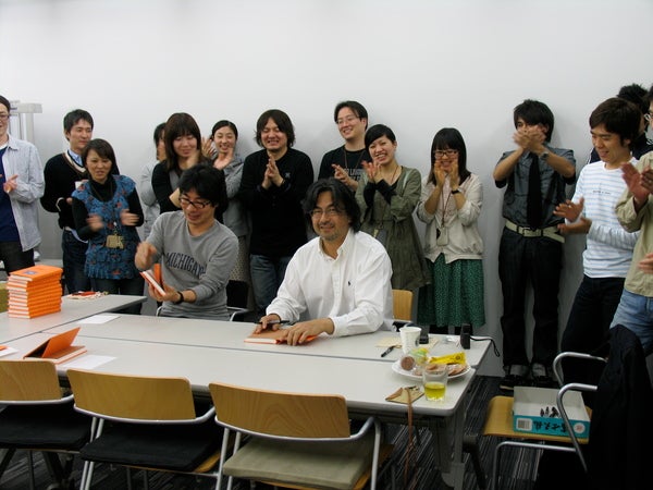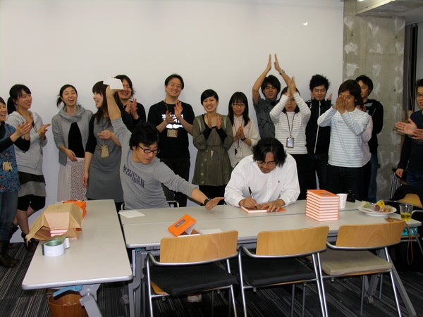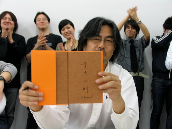 わぁー!どうやらきょう買って来たばかりの油性のサインペン1本が先ほど、天に召されたようです。追加のサイン、500冊ついに終わりました!鳴り止まぬ拍手のなか、うれしそうな菅原一剛さんと微動だにしない半紙入魂戦士をご覧いただきながら本日は、終わりにしたいと思います。ほぼ日ストアで「写真がもっと好きになる。」をご購入いただく方に先着1500冊まではサインを入れてお届けしますね。みなさま、どうぞよろしくお願いいたします〜!