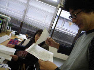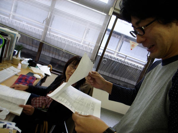 「吉本さんチーム」のさんとさんは、出社早々、細かいリストを手に打ち合わせ中。このほかのメンバー、ちゃん、さんもこのところすこし慌ただしく吉本さんまわりの仕事をしておりますよ〜。