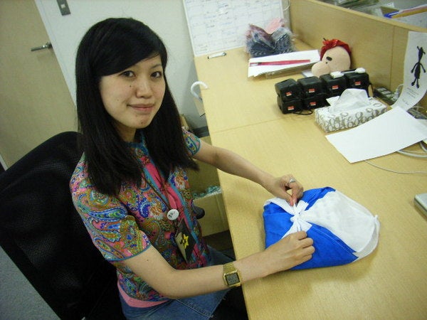 【2】 次に、【1】で結ばなかった角同士を 三角形の真ん中あたりで 結び合わせます。 このとき、中にA4サイズくらいの 本などを入れると 形がつくりやすいですよ〜。 こちらも、ぎゅっ!と固く。 バッグがほどけたら大変ですものね。