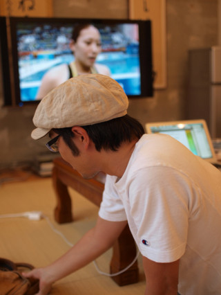 「カフェ五輪よりお知らせです。 さきほど山口工務店の手により、 『トリプル・フグカメラ』に、 オリンピック・ メダルカウントシステムが 装備されました。」こちらは、日本選手がメダルを獲得すると、カフェ五輪のマスターが、フグの水槽にぺたっとシールをはりつけにいきます。こちらのフグカメラで、メダルの数をカウントしつつ『観たぞ、北京オリンピック!』をおたのしみくださいませ。