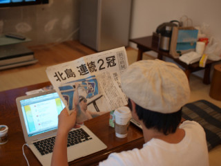 きょうの更新は済んだので一回家に戻ったらどうですか。「そのつもりです。 風呂入ってまた夕方来ます」いやはや、いつ寝てるんだろう‥‥。せめて、コンテンツをたのしみにしているみなさんのために、「にっこり」笑った顔を撮ってもよござんすか。「え、そんな、いや、アハハハハ」下向かないでくださいよ。ハイ、チーズ!「ん!」写真の苦手な永田のにっこり画像は撮れませんでした。