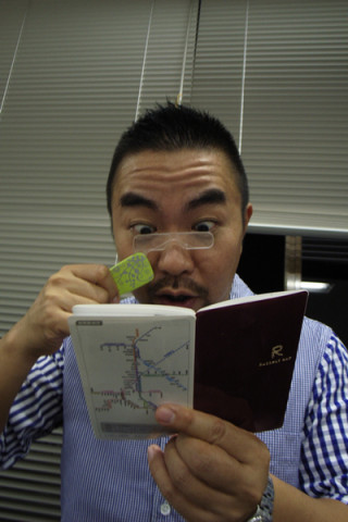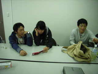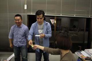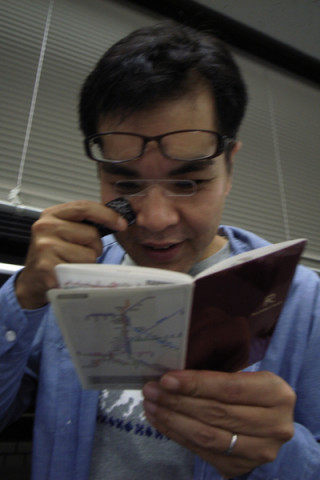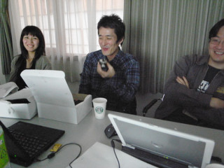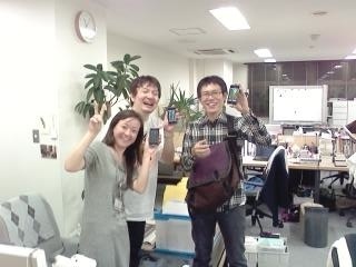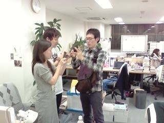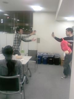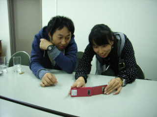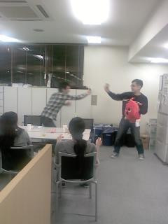 なにかと思ったら、 iPhoneにいれているらしい 剣のゲームで、 大のオトナが2人で 対決しているではありませんか。