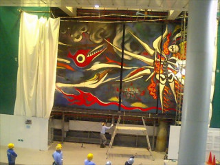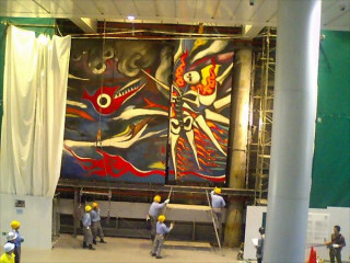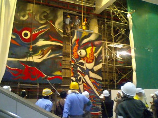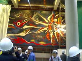 壁画の中央部分にあたる骸骨が、箱から出てきました。クレーンでどんどん釣り上げられていきます。思えば、愛媛県の修復現場にはじめて行ったとき、最初に見せてもらったのがこの骸骨でした。岡本敏子さんが「壁画が見つかったのよ」と、見せてくれたメキシコの写真にもこの骸骨が写っていました。
