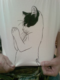 シロかと思ったら照明担当のシャチョさんでした!お友だちの版画の作品がTシャツになったそうです。「実は昨日もネコだったんだよ」え〜気付きませんでしたよ!別に大のネコ好きってわけじゃないそうです。