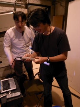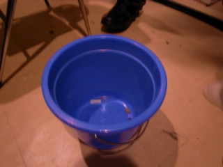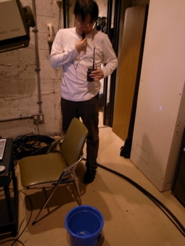 紀伊国屋ホールの舞台主任である前田さんが副調整室(音響やプロジェクターなど技術系のものが集まっている小部屋です)にバケツを持ってきました。「雨がふるようなので」ということです。ホールの中にいると天気のことがぜんぜんわかりません。XVDを駆使しつつ、バケツで雨を受け止める。今昔の融合といいますか、アナログとデジタルのマーブル模様な感じがなんだかこのプロジェクトらしいですね。念のため、客席やホールではいっさい雨漏りはしませんのでご安心ください。
