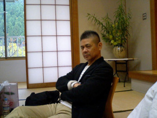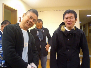 徳島出張組、本番前にごはんをいただいています。ますのお刺身にあしらわれたいろどりの、はすいもの葉っぱがきれいだなあ。糸井にカメラを向けたらギロッとした視線。「悪意を表現しています。悪意2008というタイトルにしておくように」というので、そうしますが意味はあまりないと思います。