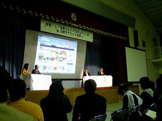 中学校の体育館でいろどりの横石さん、クオカの斎藤さん、立木さとみさん、糸井重里によるトークショーがはじまりました。