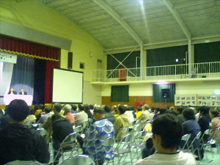 トークショー会場の上勝中学校にはたくさんのお客さま。このなかにはいろどりのおばあちゃんたちもいらっしゃいます。いろどり、クオカ、ほぼ日、それぞれのビジネスについてお話が進んでいます。