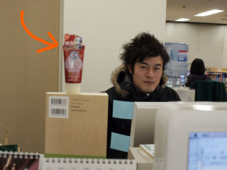 祖父江さんは、なにか真剣そうな打合わせをなさっています。標本がえるを友に静かにお茶をいただいていると、目の前の巨大モニターの上からにゅっと人が。「こんちはー」ああ、いつか魔界の淵のような製作作業の日々を送っていた際にとてもお世話になりながら1年以上もちゃんとお名前を存じあげなかった、コズフィッシユの吉岡さんです。どうもー、ごぶさたです。