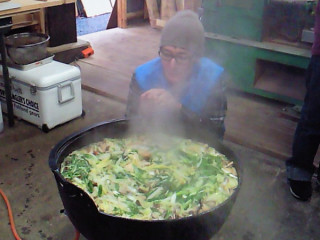 大きな鳥鍋の前を陣取るはりさん。確かにいい匂いですが、近過ぎます…。