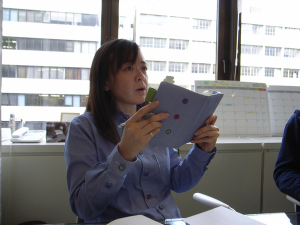 菅野さんは言うのです。「がはははは。 おそろいやで。おそろい。」というようなことを。なんのことやら、とおもっていたら、シャツと手帳カバーがおそろいでした。あんがい迫力がありますね。アイテムと洋服のおそろい。えー、こちらの会議、そのような話をするだけの場でなく、きちんとゴールデンウィークのスケジュールの確認やらなにやらいつもの「読み物チーム」の定例会議の一こまでした。