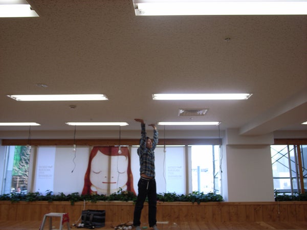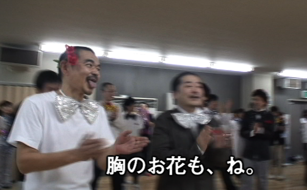 設営はただいま、マイクテストの段階まで進んでいます。「お、マイクテストっぽいぞ。」そういって、永田さんと山下さんが歩いていきます。どうよ?この「冷やかす気まんまん」の背中を。猛烈設定中の宇宙部‥‥っていうか、しばらくみていないうちになんだか、機材がえらいことになってるけど?「ほぼ弊社の自前です。 コツコツと増やしてきました。」と、宇宙部(兄)はいいます。おじさんたちは、冷やかしたのち、次のターゲットにむかいました。
