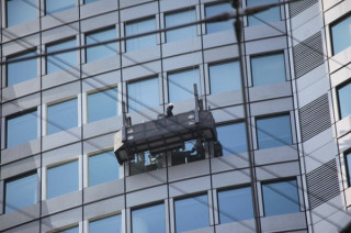 むこうのほうに、「明日の神話」を修復した吉村絵美留さんがいらっしゃいます、と、ぐっさんが望遠レンズを駆使して絵美留さんのお姿を映しました。その後、おーい、えみいるさん! と手を振る我々。しかしその望遠すごいね、もっと撮ってみてよ、という話になり、撮ったのが、六本木ヒルズの窓拭きの写真。