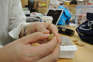 1 落花生の くちばしのようになっているところの 下の部分を 両手の親指を重ねるようにして パキッと押します。