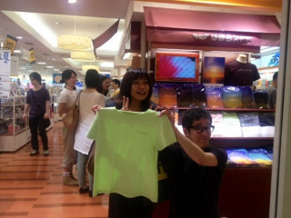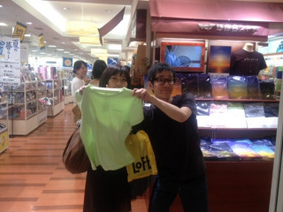 たまたまいらしたお客様と記念撮影。Tシャツをお買いあげの方でした。このあと社長は、ロフトでふつうにお買い物をしました。めがねとか、バッグとか、コンセントとか、ライトとか。「旅もあるからね、 ちょうどいいときに お買い物ができてよかったです」買い物を終えると、じゃ! と手をあげ、社長は帰っていきました。というわけで、社長の抜き打ち訪問は、終了。みんな! 油断しないでがんばろー!
