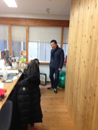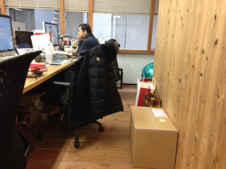 の机に行く通路が 完全にふさがれちゃう寸前に! 彼の背後の不思議な三角スペースには