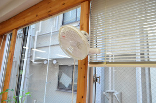 空気がこもって暑いらしい という話もあるので、 扇風機もセットしておきました。 微妙に風呂屋感がでて、 のんきな雰囲気が漂います。