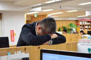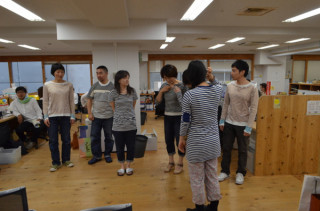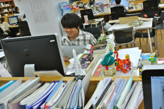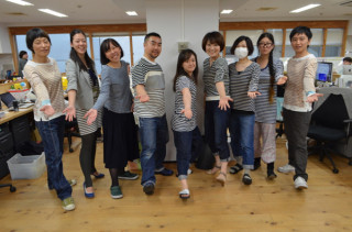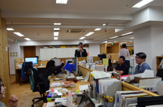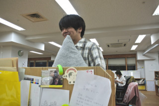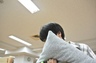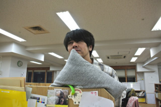 いま、 は 企画がクライマックスを迎えているため みんなへの相談ごとが多い。 目立つのはしょうがない。 そして、社内どこでも クッションを抱きつづける、 それもまぁ、よいでしょう。 こらこら 、うしろでピースしない。