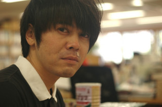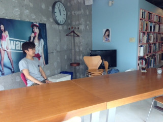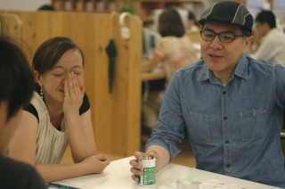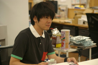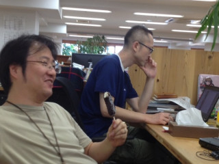 横の席の人( )と 向かいの席の人( )が 仕事をしながら、 そろってアイスを食べはじめました。