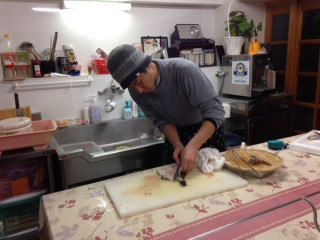 料理番長の、つなかんの りょうすけ君が さっそくさばいてくれています。
