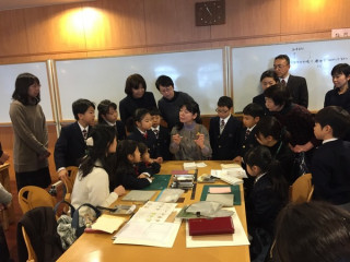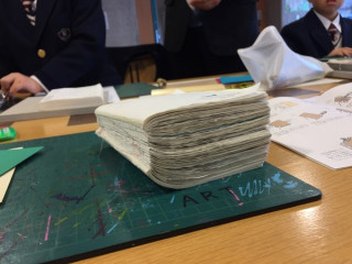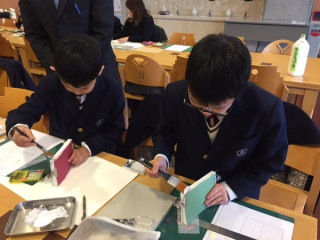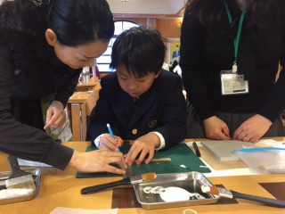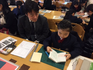 今日は、美篶堂のみなさんと 京都の立命館小学校にやってきて、 使いはじめてもうすぐ1年になる みんなの、1年間のいろんな思い出が つまったほぼ日手帳を 美篶堂の上島明子先生と一緒に じぶんたちで本に仕上げる ワークショップを開催しています。