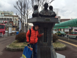 中継チームとは別に荒井良二さんと気仙沼に向かっています。こちらは、明日3/11のコンテンツのために移動中です。一ノ関の駅前に大槻三賢人の像というものがありましたので、せっかくですから記念撮影です。