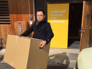 さだまさしコンサート中継チーム、到着しましたー。「気仙沼のほぼ日」です。この看板も年季が出てきたねー。ホッとひと息入れたりせずに、さっそく荷物の積み込みなど。おお、さゆみちゃんもこんにちはー。