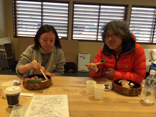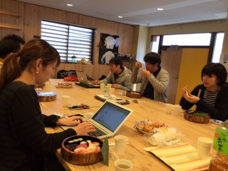 気仙沼のさだまさしコンサート中継チームです。本格的な設営の前に昼食です。お寿司だ、お寿司だ。食べよう、食べよう。で、そこに、ゲストもいらっしゃってますよ。さきほども写ってましたが、荒井良二さんです!じつは明日、いろんな方に、「気仙沼の街を描いてもらう」というコンテンツを企画しているのです。あの日から4年が過ぎた気仙沼。糸井もいっしょに街を歩く予定です。明日一日、テキスト中継しますのでどうぞおたのしみに。