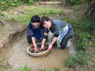 「はい、もっと足で田んぼをかき回しながら、 じゃぶじゃぶ染めて! もっと足で田んぼをかき回して! 手も動かして!」