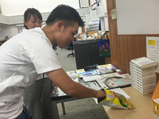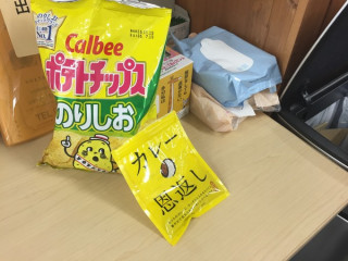 そして、社内の おみやげなどを置く台に のりしおチップスを やさしく載せておきました。