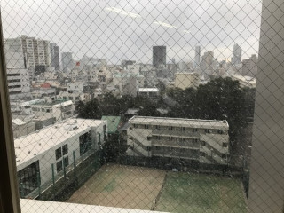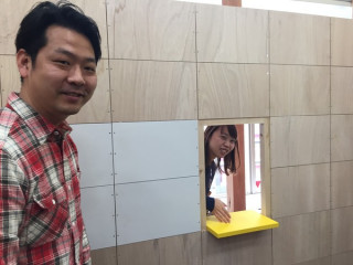 会社のひな段前の広いスペースに 箱状の、ブースのようなものが 設置されました。 木製で、ところどころに 小窓があいています。 色が塗られた部分や 小さなたくさんの穴があいている 部分もあります。