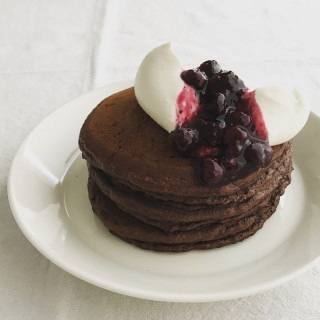 「ホットケーキ」の材料には 生クリームが必要でして、 200ミリリットル入りのパックを買えば 半量をホットケーキに入れて、 半量はホイップクリームにできる すんばらしい配合。 小さめのホットケーキを数枚焼いて、 ふわっとクリームとフルーツを。 なかしまさん曰く 「ふつうのスポンジケーキと同じように ホイップクリームでデコレーションすれば かんたんにチョコレートケーキも 作れますよ。」 とのことですよ。 フライパンでつくれるチョコレートケーキです。