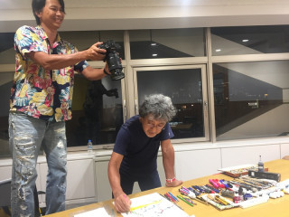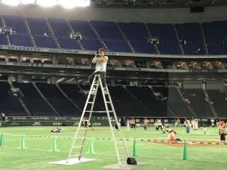 ところでね、 「野球であそぼう」は、 ゲーム終了後にフィールドに降りて、 うきうきできる時間があるのですが、 そのまえに、参加者みんなで 記念撮影をするですよ。 そのときの脚立カメラマンは です。 なんか、いい仕事だなーとおもって 毎年写真をとってしまう。 |