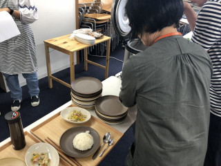 ホールに入ると、 食べはじめていたみんなから さっそく感謝の声をかけられました。 「おかあさんたちのタイ料理、 おいしいよー! 給食でタイ料理って新鮮! リクエストありがとう!」