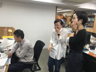 「ひとり人海戦術」をモットーに?している 彼女は、みんなに手書きの紙を配り、 その場で、修正がはいったところに 「これはフリクションで書いてあるので 消してください」と言い、 「あれ、コピーなのに?」 「わ!消える!!」 と驚かせてくれました。