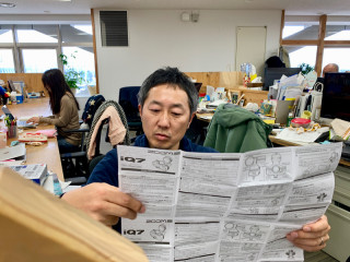 これは朝の忙しい時間帯に 新聞を読んでのんびりしているおとうさん、 ではなく、 新しく買ったマイクの説明書を読んでいる