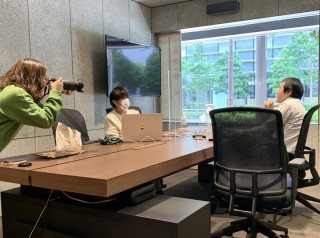 しかし、あの大判プリンターでは わたしは出力できないぞ。 というわけで、そばにいた インターンの青年・ちのくんに相談したのち、 3Fにいたら、お迎えが。 「プリンターのある階に、