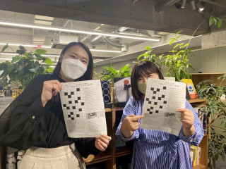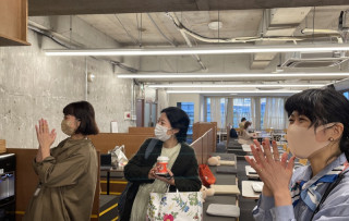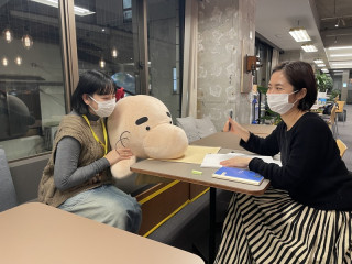 何かの設定で苦戦をしていて、 システムチームのたえさんに 慎重に、指示を仰いでいるようす。