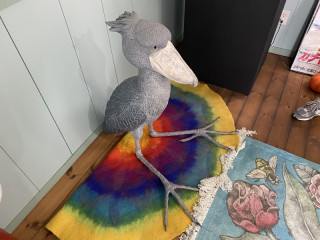 入り口では、ほぼ日の受付にもあるゴリラが 「ようこそウホ」とおでむかえ。 ハシビロコウの置物もインパクト抜群です。 ハシビロコウって、こうやって座るんだ....