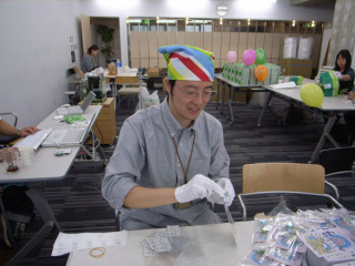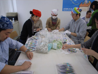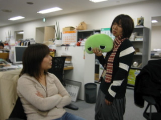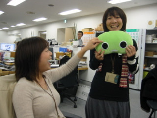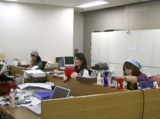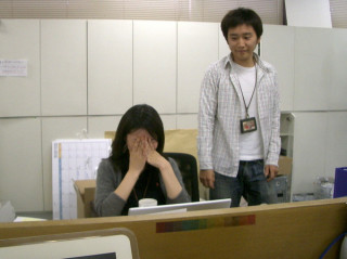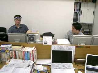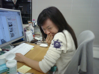 さっきまで泣いていたも、左右の席にゆかいな仲間が帰ってきてハッピーになったもようです。バンダナを巻いたゆかいな仲間は、バザーで焼きそばをジャージャーさせていたママさんたち‥‥じゃなくて飴発送でがんばっていた&です。サイン会会場と同じテンションで自席に戻り、ごくフツーに仕事をしている姿がけっこう笑えます。もはちまき姿のまま経理の仕事を続行しています。ゆかいな仲間は、ありがたい。
