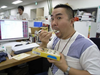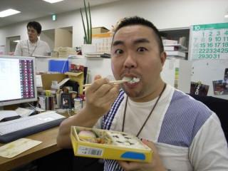 !ちょっと明日の中継のことで聞きたいことがあるんですが〜。「んが?」ちょっと!なんでまたご飯たべてるんですか!さっき、みんなでたくさん食べたじゃないですか。「たくさん原稿かくと お腹がへっちゃうよ。 が 僕の大好物の 崎陽軒のシュウマイ弁当を くれたんだもん。」