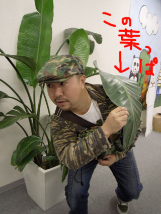 あ、観葉植物の葉っぱが折れてる。これは先日「おしゃれ軍人」が隠れていた葉っぱじゃないですか。さっきまで、くったりしていたんだけど、とうとう折れてしまったようです。せっかくなので、切って茂木さんに渡してみました。「どうかしら」「いーねー! ちょっとシャイニーにしてみましょうか」「いーねー!!」
