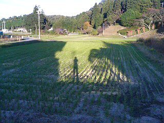 田んぼに、長く伸びる自分の影。